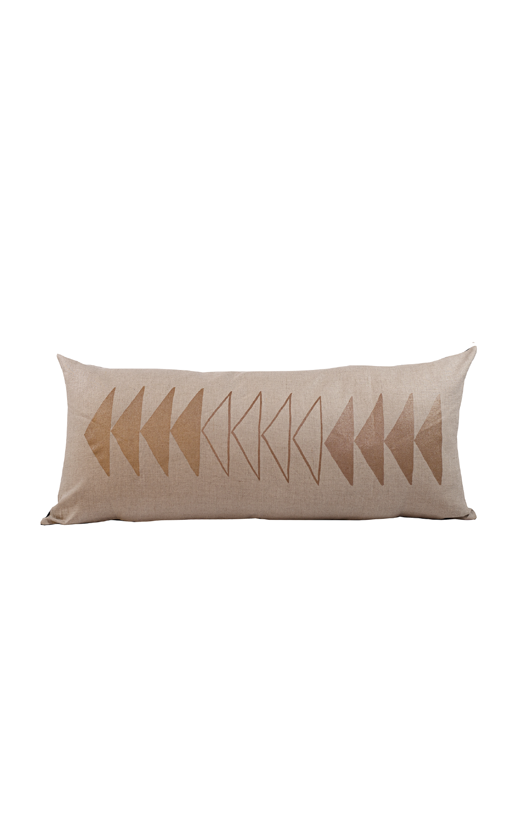 The Copper Arrows lumbar pillow is 15" x 34", made of 100% pre-washed linen, and hand-printed with non-toxic ink.