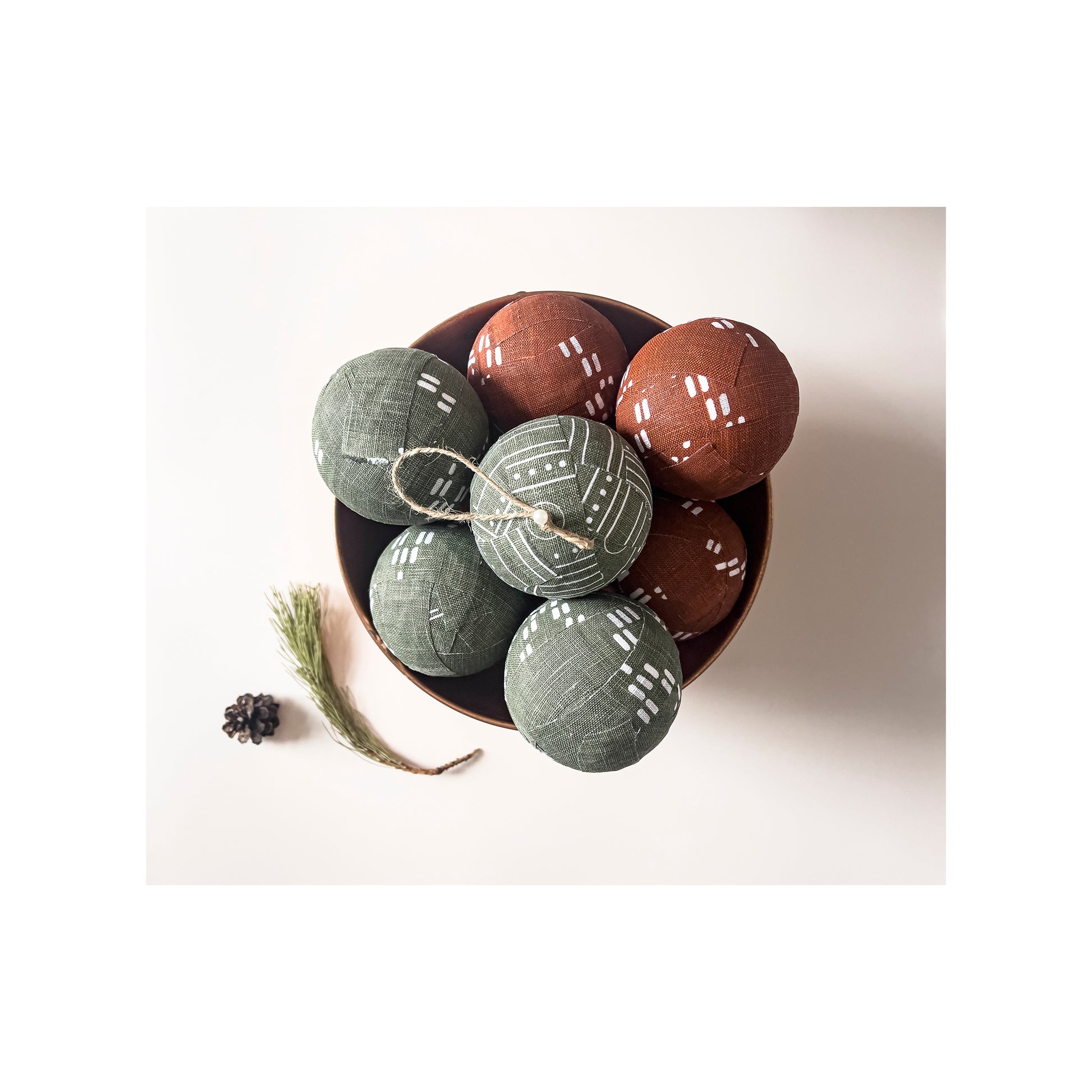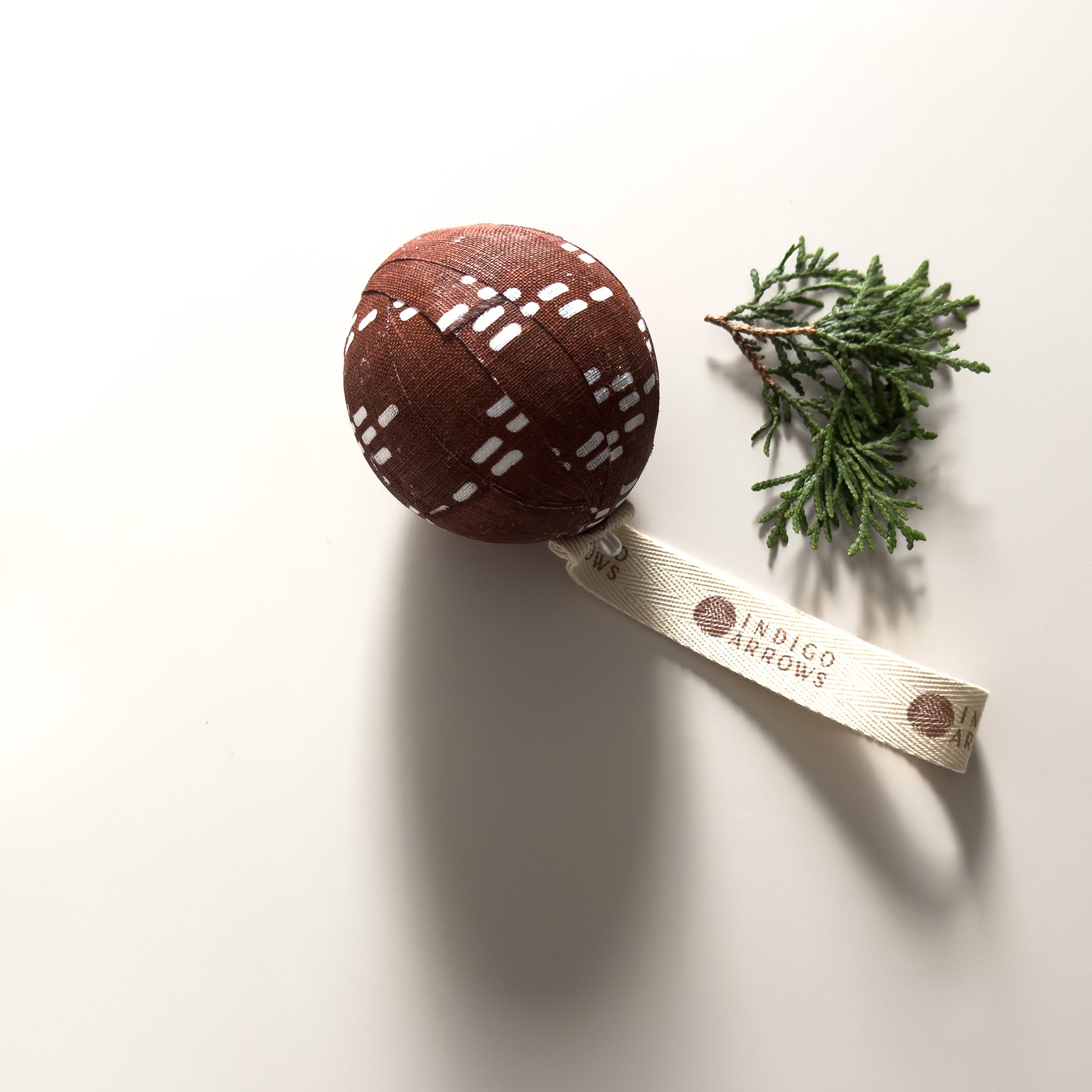 Our limited edition holiday ornaments made with our Niizh linen in red earth linen. Niizh, two in Anishinaabemowin, is a pattern inspired from Indigenous pottery from Southern Manitoba dated to be over 3000 years old. Each one is 3" in diameter with a pearl pin and woven tape for hanging. While supplies last.