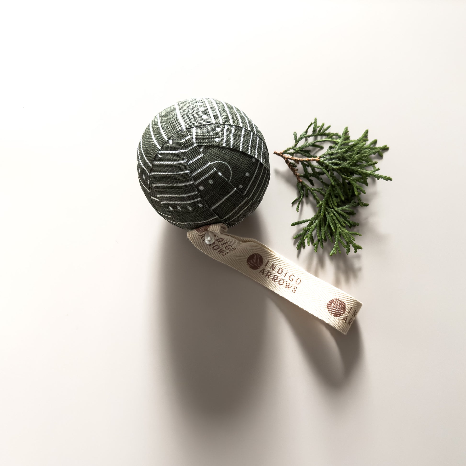Our limited edition holiday ornaments made with our Bezhig linen in Boreal green linen. Bezhig, one in Anishinaabemowin, is a pattern inspired from an elk antler bone tool from Southern Manitoba dated to be over 400 years old. Each one is 3" in diameter with a pearl pin and custom woven tape for hanging. While supplies last.